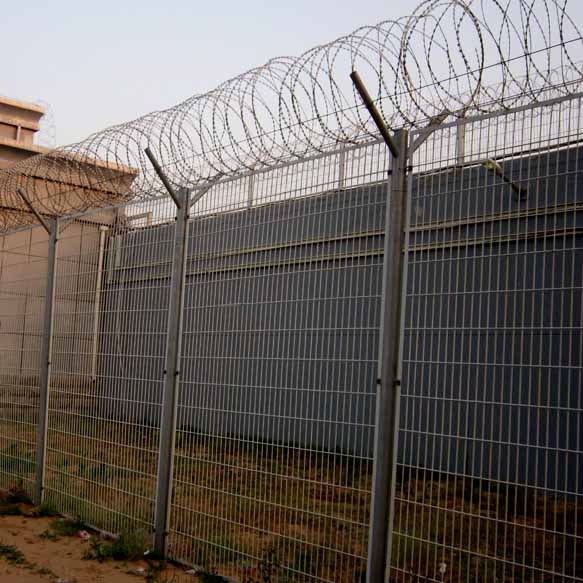 監(jiān)獄鋼網(wǎng)墻又稱作"Y型安全防御護(hù)網(wǎng)",是由V型支架立柱加強(qiáng)型焊接片網(wǎng),安全防盜連接件和熱鍍鋅刀片刺網(wǎng)組成強(qiáng)度和安全防御性級(jí)別很