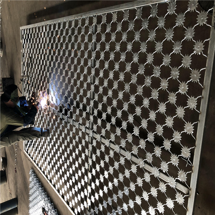 監(jiān)獄帶剌的隔離網(wǎng)網(wǎng)片、立柱要求整體熱鍍鋅,上鋅量不低于100克,可做霧化試驗(附檢測報告) ,護欄網(wǎng)整體鍍鋅在內(nèi)陸自然環(huán)境下,鋅層要求使用不低于10年。監(jiān)獄太陽花隔離網(wǎng)看守所梅花刺美格網(wǎng)護欄